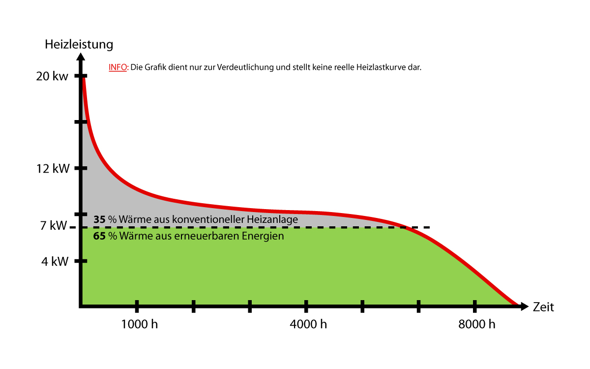 Gemäß § 71h Absatz 1 kann eine Wärmepumpe mit Gas-, Biomasse- oder Flüssigbrennstofffeuerung kombiniert werden, falls sie allein nicht ausreicht, um Heizlastspitzen zu decken. Dabei muss die Wärmepumpe vorrangig betrieben werden, um die Vorgabe von 65 Prozent erneuerbaren Energien zu erfüllen. Der Spitzenlasterzeuger darf nur eingesetzt werden, wenn die Wärmepumpe den Wärmebedarf nicht mehr decken kann. Die thermische Leistung der Wärmepumpe muss gemäß DIN EN 14825 im bivalent parallelen oder bivalent teilparallelen Betrieb mindestens 30 Prozent betragen. Im bivalent alternativen Betrieb des Spitzenlasterzeugers muss die thermische Leistung mindestens 40 Prozent betragen. Eine gemeinsame, fernansprechbare Steuerung für die Wärmepumpen-Hybridheizung ist ebenfalls erforderlich. Wenn gasförmige oder flüssige Brennstoffe verwendet werden, muss ein Brennwertkessel installiert sein.