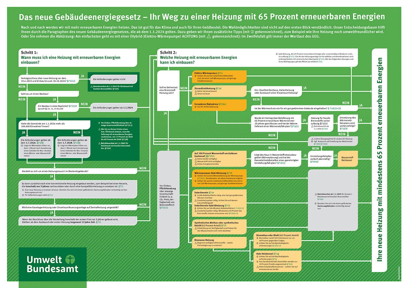 Im Gebäudeenergiegesetz sind neun Möglichkeiten vorgesehen, wie die 65-Prozent-Regel pauschal erreicht werden kann. Für die technologieoffene Variante ist eine individuelle Betrachtung z.B. durch einen Energieberater erforderlich.