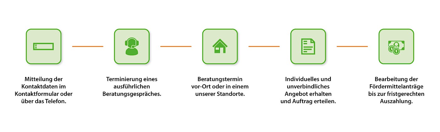 Sobald Sie uns Ihre Kontaktdaten im Kontaktformular oder über das Telefon mitgeteilt haben, terminieren wir gemeinsam ein ausführliches Beratungsgespräch. Diese kann Vor-Ort bei Ihnen im Ruhrgebiet, digital oder in einem unserer Standorte stattfinden. Im Gespräch analysieren wir ihr Bau-, Sanierungs- oder Modernisierungsvorhaben, prüfen Fördermöglichkeiten und erstellen ein individuelles Angebot. Nach Beauftragung übernehmen wir die gesamte Antragsstellung für Fördermittel bis zur Auszahlung