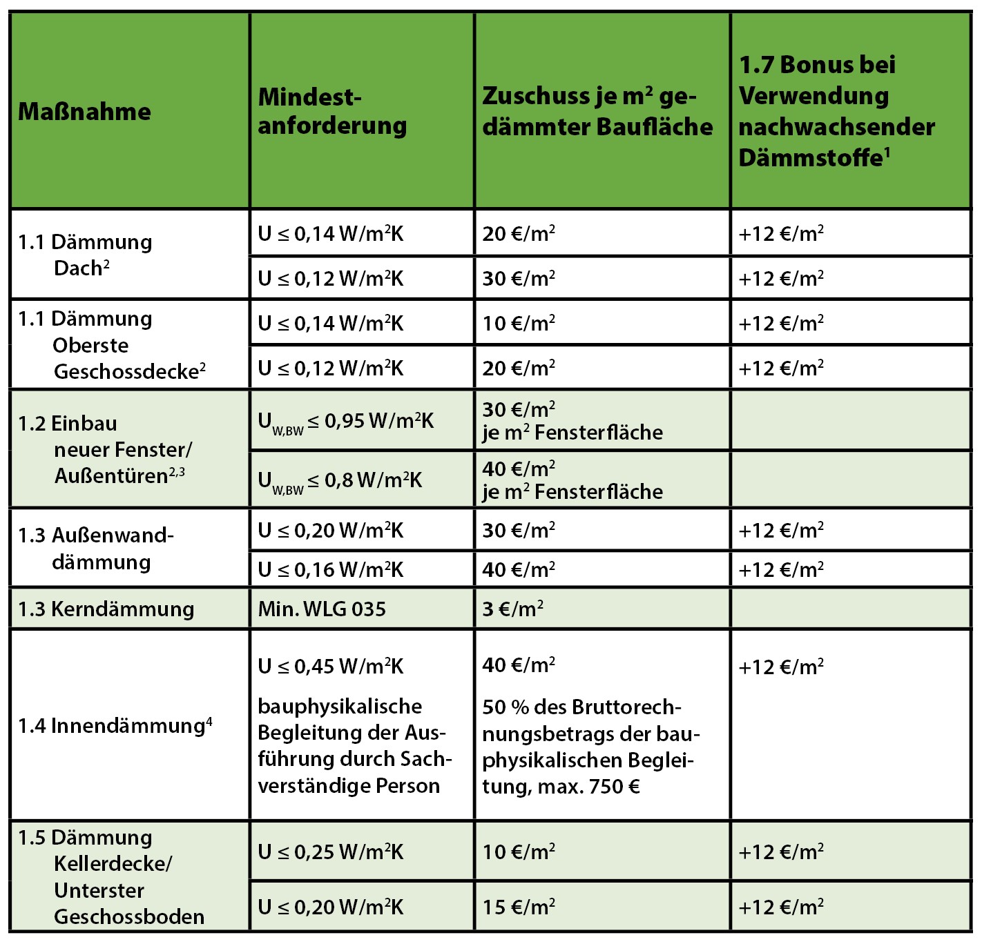 Der Förderbaustein ermöglich es Dämmmaßnahmen für Wohngebäude zu fördern. Anhand der Übersicht kann man die jeweilige Zuschusshöhe ermitteln. Hierzu muss bekannt sein, welcher U-Wert (Wärmedurchgangskoeffizient) erreicht wird und wie groß die zu sanierende Fläche ist. Der Einsatz nachwachsender Dämmstoffe ermöglicht es erhöhte Fördersätze zu erhalten. Werden im Rahmen einer Sanierung mehrere ganzheitliche Maßnahmen umgesetzt, kann ein zusätzlicher Bonus beantragt werden.